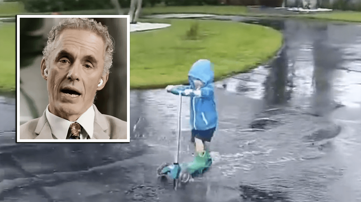 A little boy riding his scooter in the rain. While Jordan Peterson provides narration on the importance of appreciating the time when they're little kids.